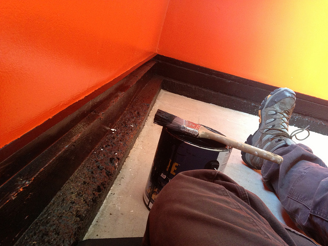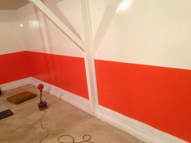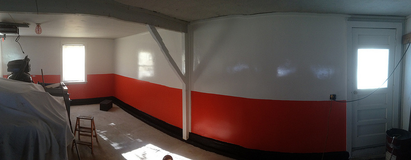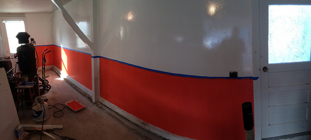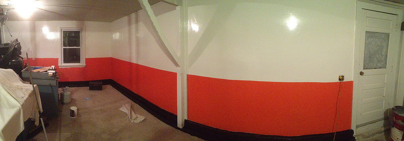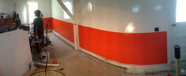 -start with mud and paint. Going to use an oil based exterior high gloss paint so if i happen to lean on it with a greasy hand i can easily wipe it off. It will also help with lighting. Pure white for the upper portion of the walls and a Hugger Orange for the bottom part. then paint the foundation black. all high gloss.