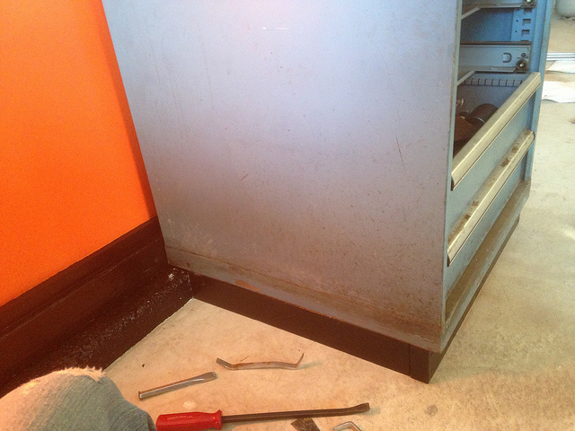 I built 4x4 frames to put under all the cabinets that way i could rest them up on top of the edge of the foundation and as close to the walls as possible. I also painted those. it raised them off the floor a bit and helps when sweeping around them.