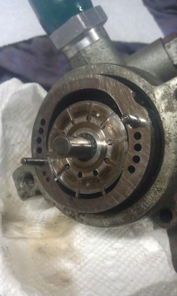 With the back cover removed you can see the cam, rotor, and vanes. This is what makes the pressure in these pumps.